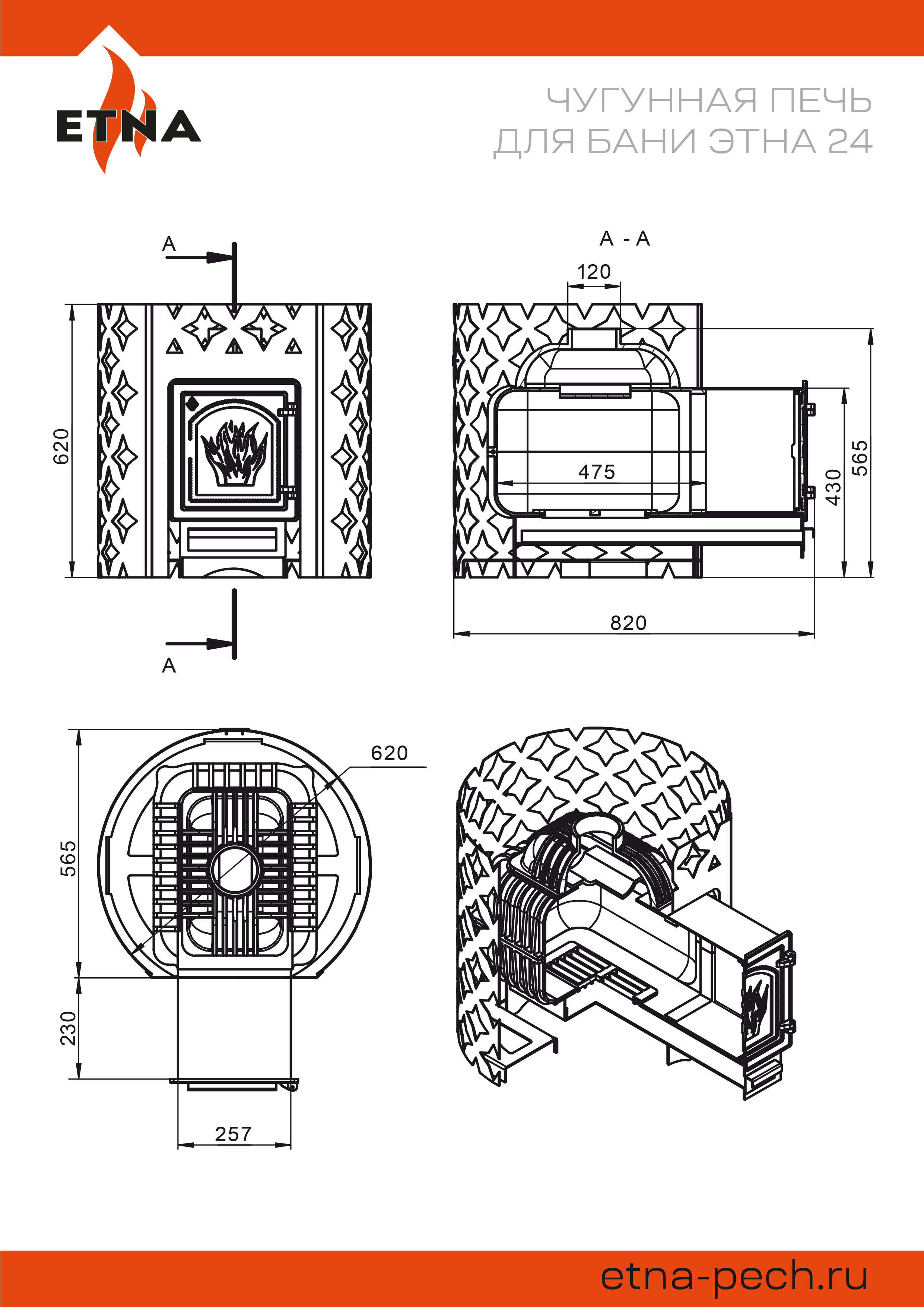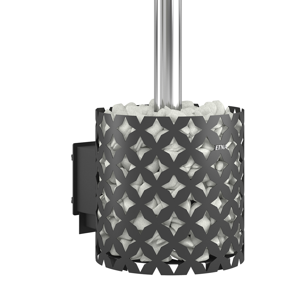 Чугунная банная печь ЭТНА 24 (ДТ-4С) рассчитана на работу в парной объёмом до 24 м3. Цельно литая чугунная дверца сохраняет свою форму при нагревании. Крепление дверок к топочному тоннелю – болтовое, позволяет снимать и заменять дверку. Для устройства наружной открытой каменки печь ЭТНА 24 оснащается металлическим кожухом с прорезным рисунком оригинального дизайна. Пространство между печью и кожухом из двухмиллиметровой стали заполняется камнями для бани, которые выполняют роль теплонакопителя и защищают парящихся от жёсткого инфракрасного излучения. Кожух диаметром 620 миллиметров вмещает в себя до 150 килограммов камней крупной и средней фракции.