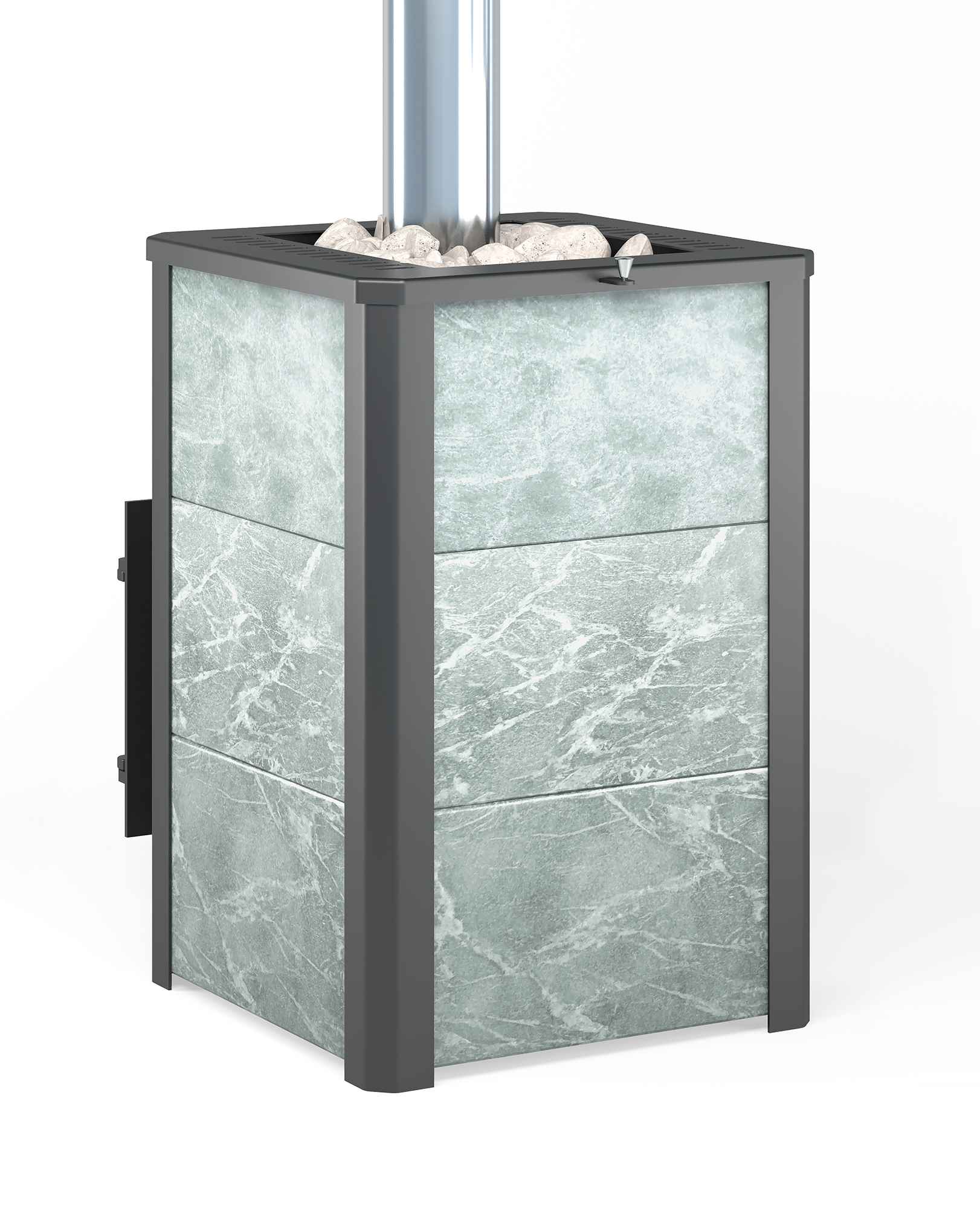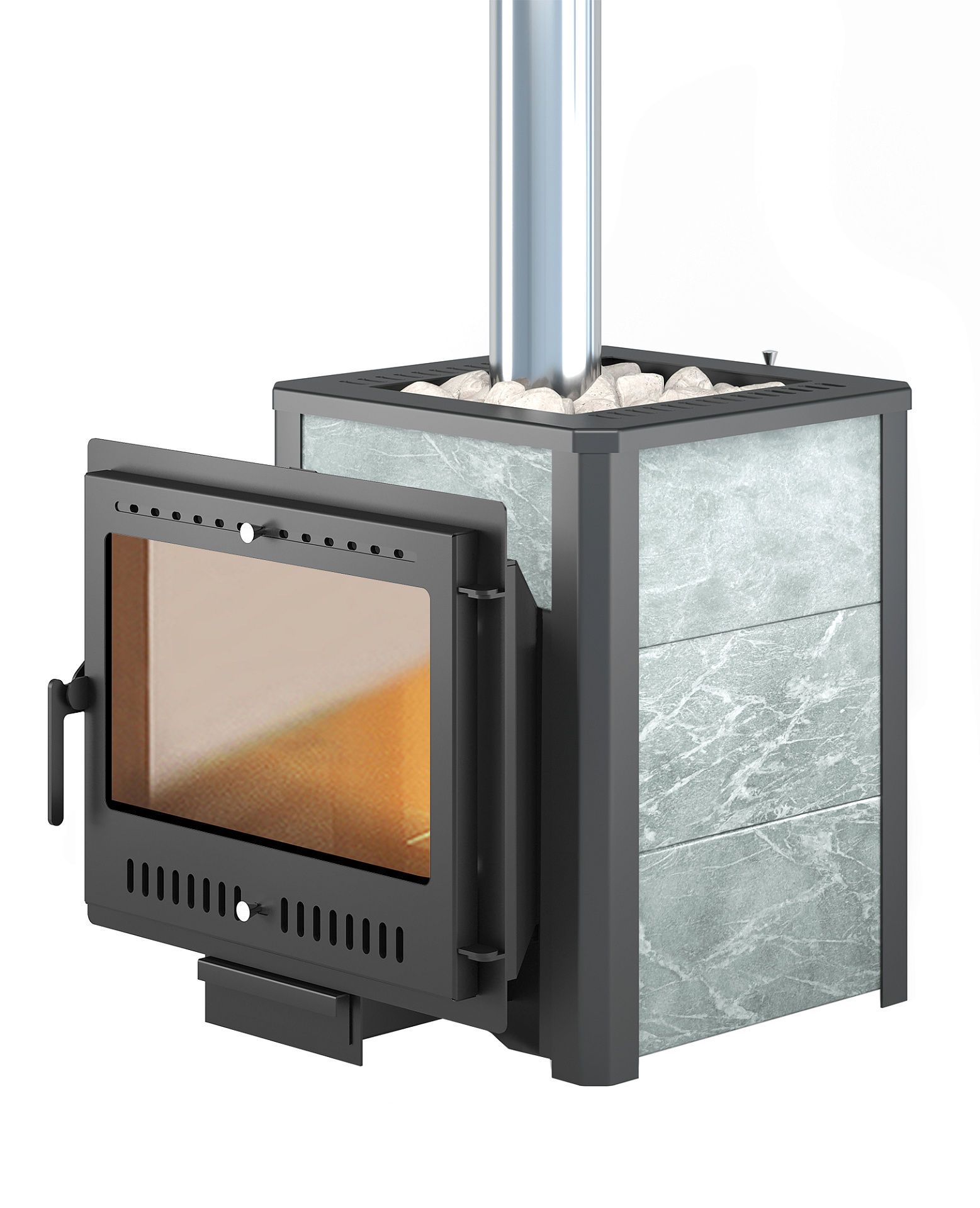 Конвекционно–вентилируемая облицовка, изготовленная из экологически чистой горной породы , который обладает большой теплоёмкостью, что позволяет камню в короткие сроки нагреваться и максимально долго удерживать стабильную температуру в парильном помещении, а также гасить жёсткое инфракрасное излучение Камень обладает исключительными лечебными свойствами: помогает при головных болях, при нестабильном артериальном давлении, при простудных заболеваниях, воспалительных процессах в почках и пищеварительной системе, снимает повышенную возбудимость и нервозность, сглаживает эмоциональные всплески. Облицовка из натурального камня при нагреве способна аккумулировать тепло, что гарантирует максимально равномерный прогрев и сохранение тепла Банная печь Легенда 16 Панорама "М" талькохлорит укомплектован чугунной каминной, самоохлаждаемой дверцей Везувий 505 с большим жаропрочным стеклом «SCHOTT ROBAX», с оборудованной системой самоочистки, что позволяет визуально контролировать горение и любоваться видом живого огня. Данная печь рассчитана на объем парильного помещения 8-18 м3.Дымоход и комплектующие