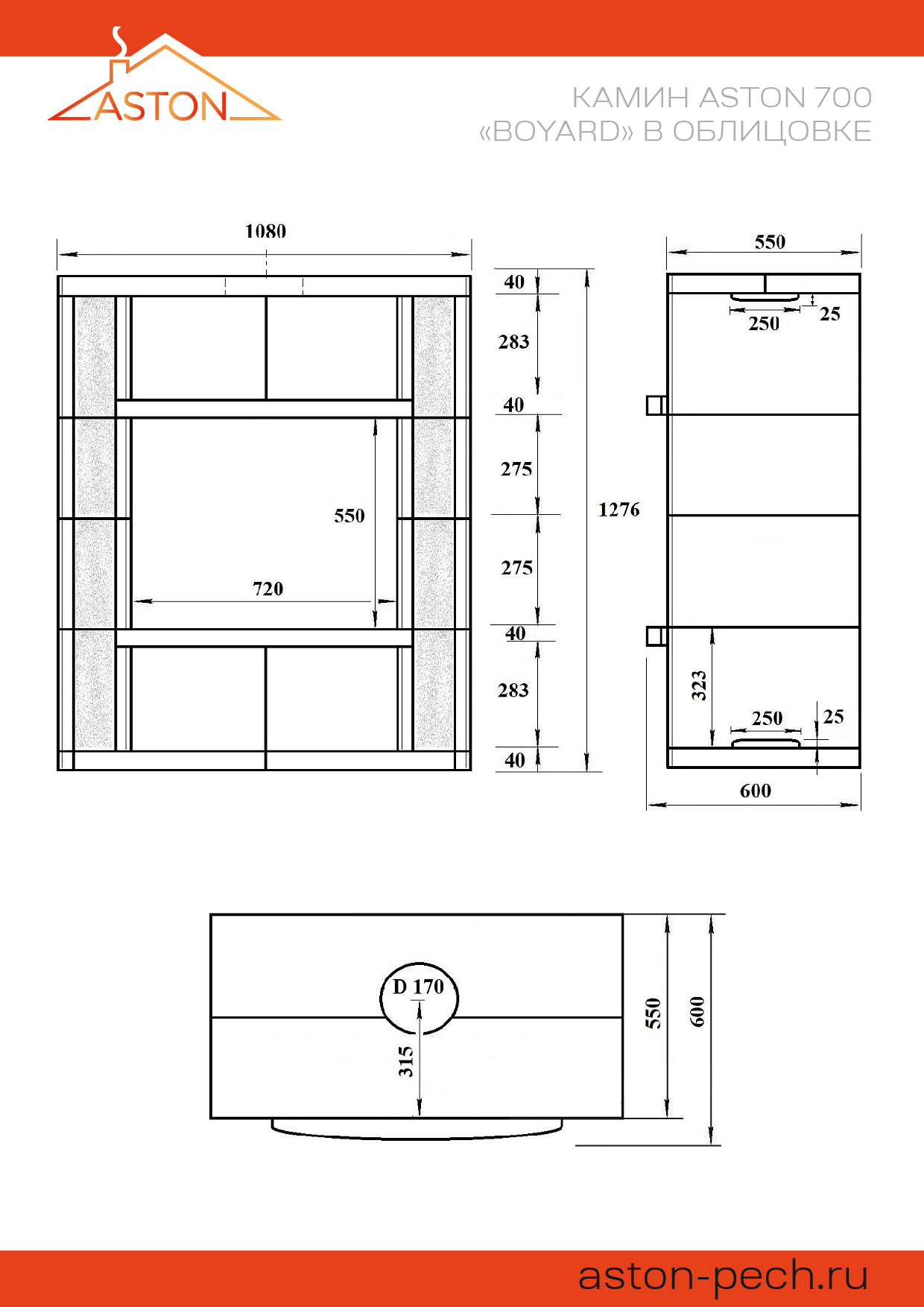 Камин БОЯРД 700 комплектуется топкой серии АСТОН (ASTON) 700. Топочная камера изготовлена из особо прочной котловой стали 09Г2С. Внутренняя глубина топки 345 мм. Внутренняя ширина топки 558 мм.