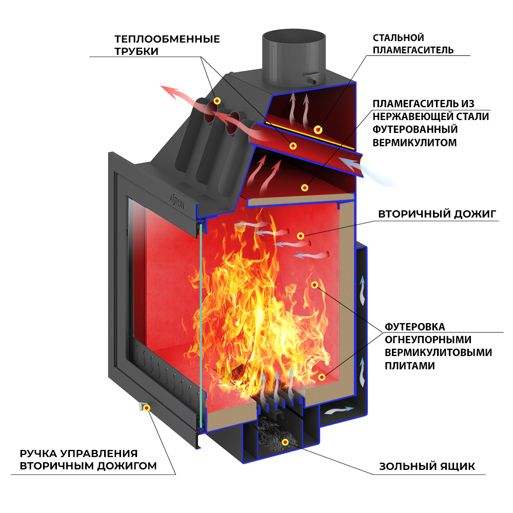 Топка АСТОН (ASTON) 800 внутри облицовки размещается на подставке. Топка, подставка и облицовка отлично походят друг к другу и не требуют дополнительной подгонки. Свободное пространство между топкой и облицовкой предназначено для движения нагретого воздуха. Именно за счёт конвекции быстро нагревается пространство, что уже в первые минуты работы топки обеспечивает тепло в помещении.