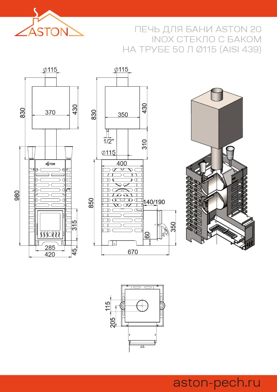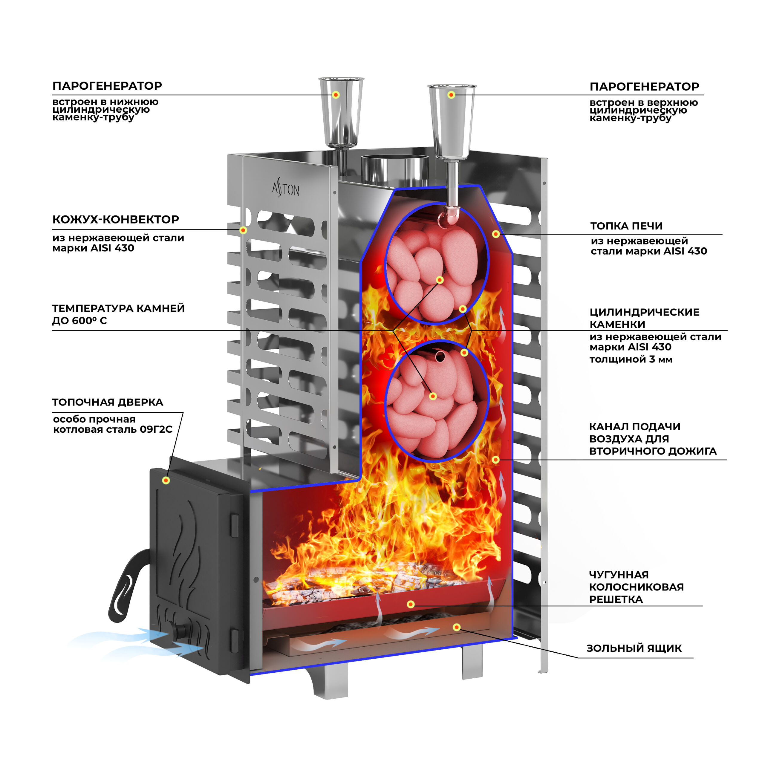 Печь АСТОН (ASTON) из нержавеющий стали марки AISI 430 устойчива к окислению и прогару.