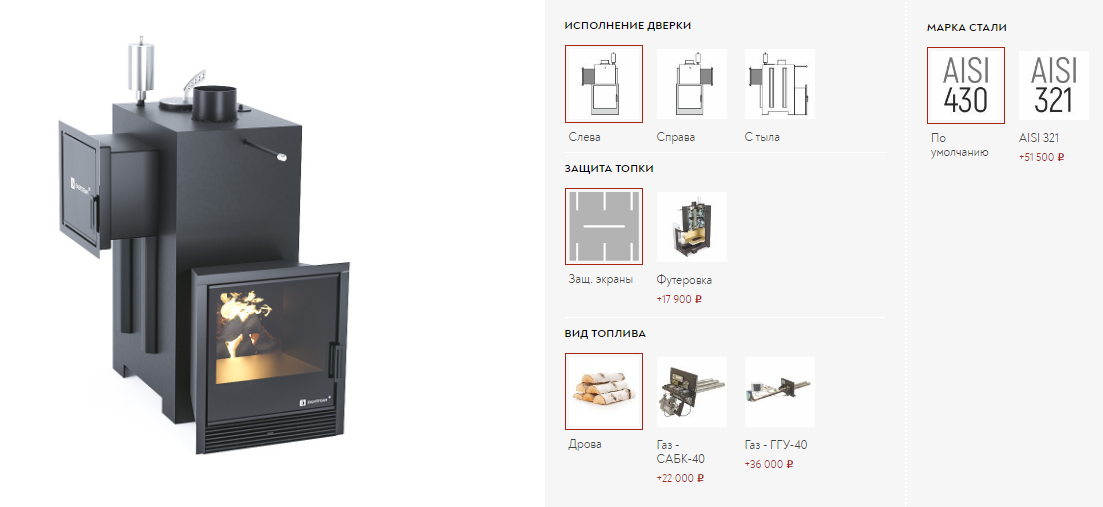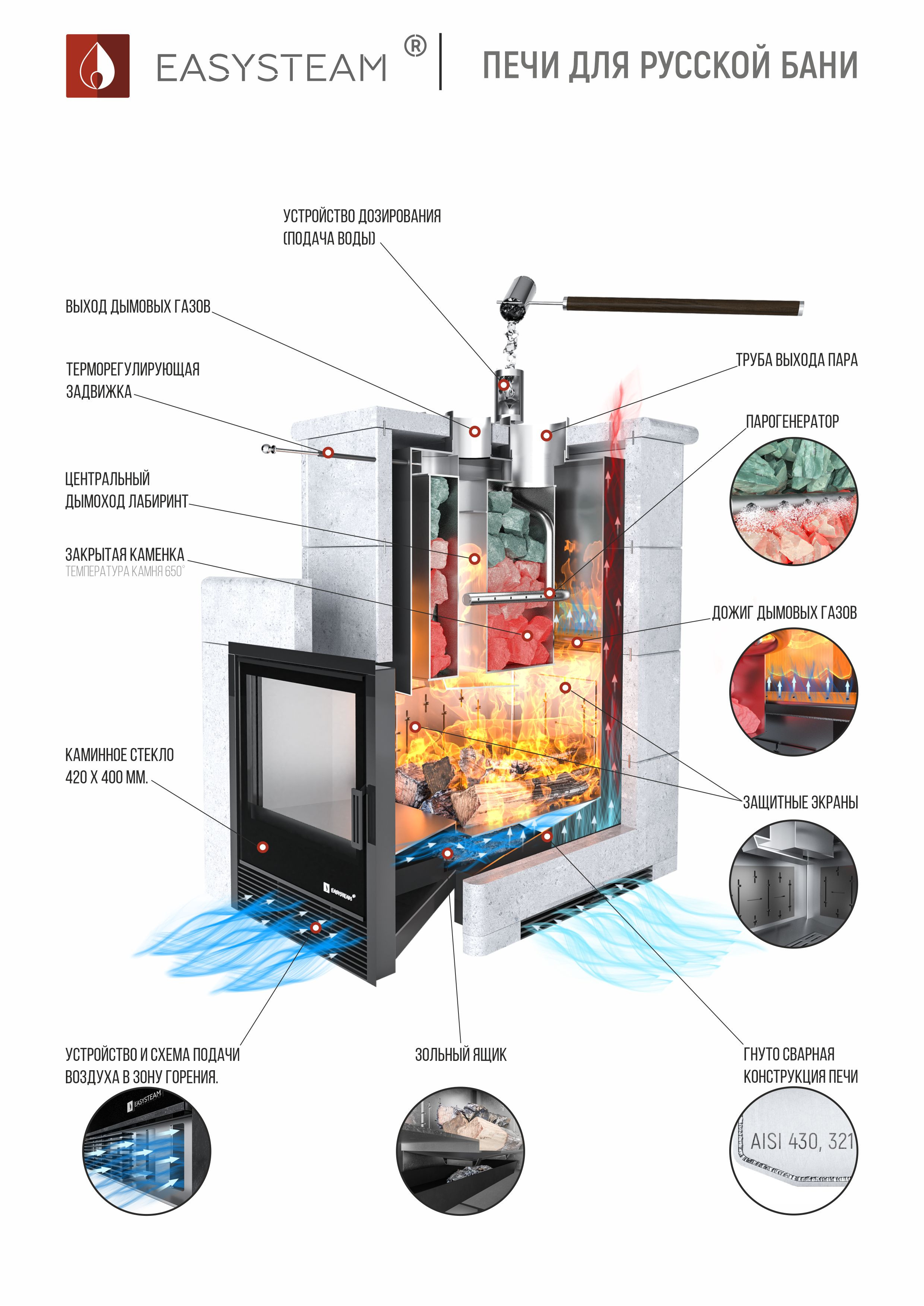 Печи ИзиСтим выполнены из жаропрочной нержавеющей стали AISI 430 4-6мм, обладают высокопрочной особо усиленной конструкцией печи и уникальным парогенератором для получения качественного мелкодисперсного легкого пара.