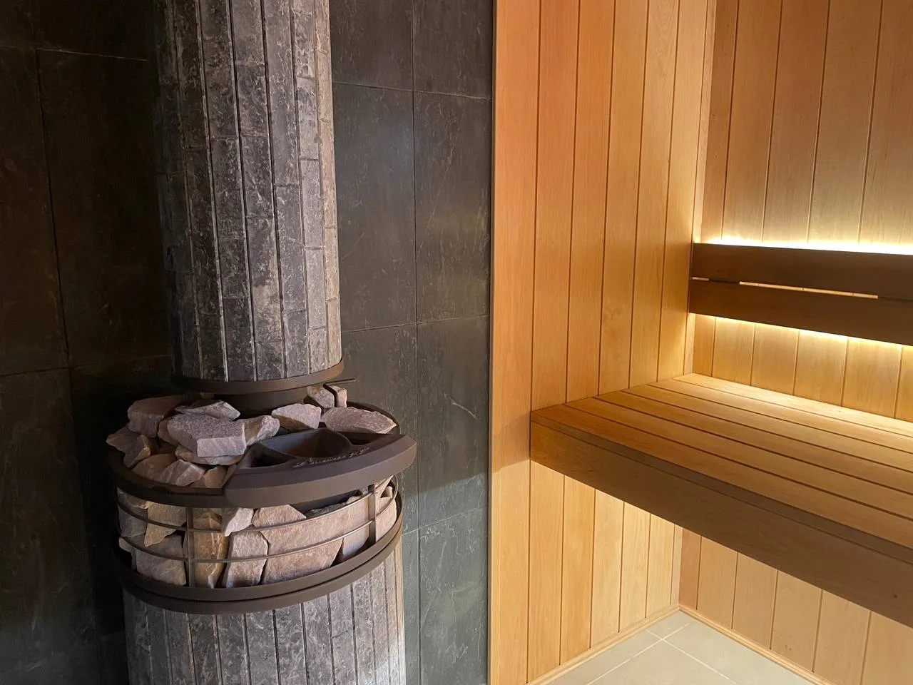 Печь банная «Атмосфера » Талькохлорит ламель+сетка с тоннелем +Сетка-каменка ламель.Установлена в парной.Отделка Вагонка и полок - ольха и термоольха.