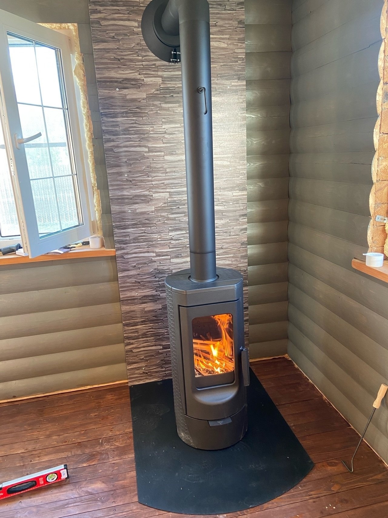 Печь камин Tara, пристенная установка, дымоход КПД черный через стену, огнезащита стены плита Flamma декор, лист под печь
